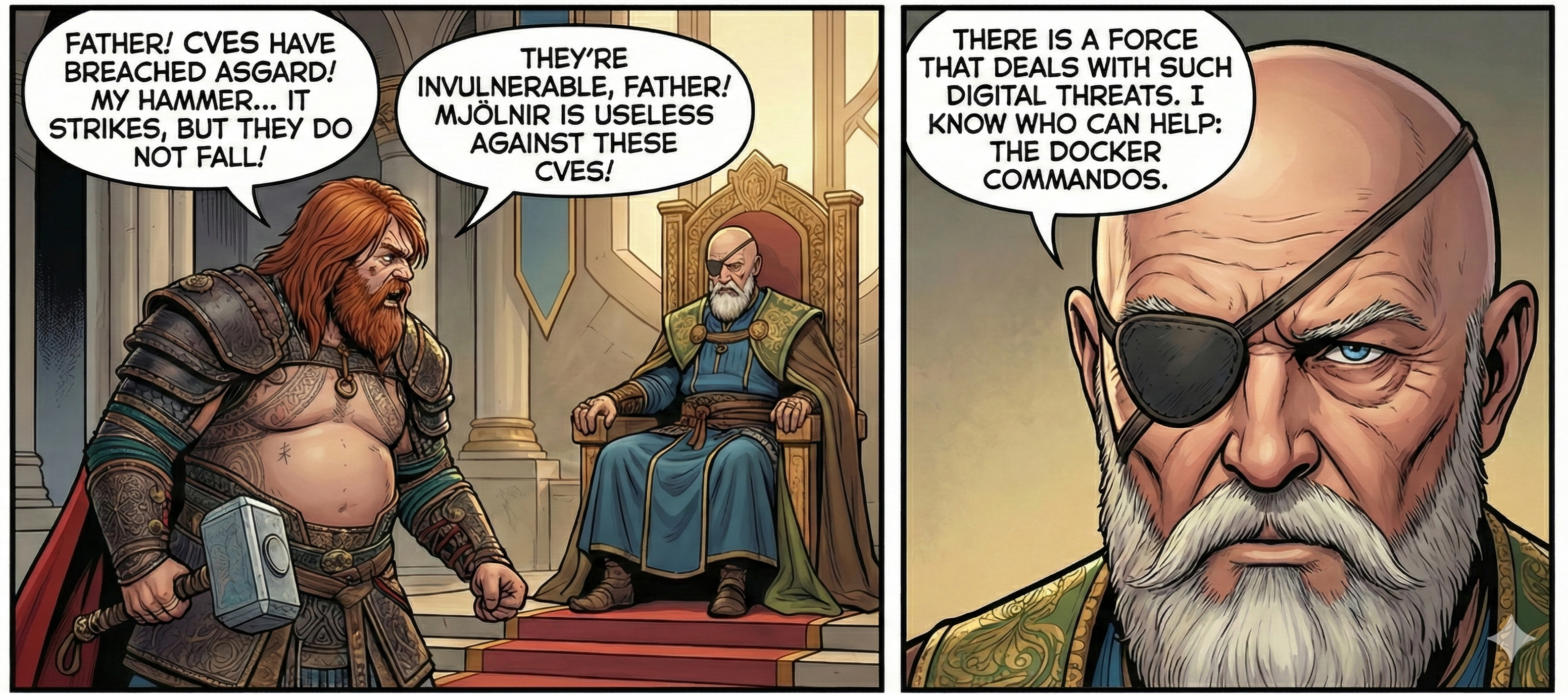 In February 2026, I gave a talk at Jfokus in Sweden. The talk was titled Dockerize Securely: SBOMs + Attestations + Bake. As the conference was Norse-themed, I created a mission for the Docker Commandos to go to Asgard and fight the CVE monsters.