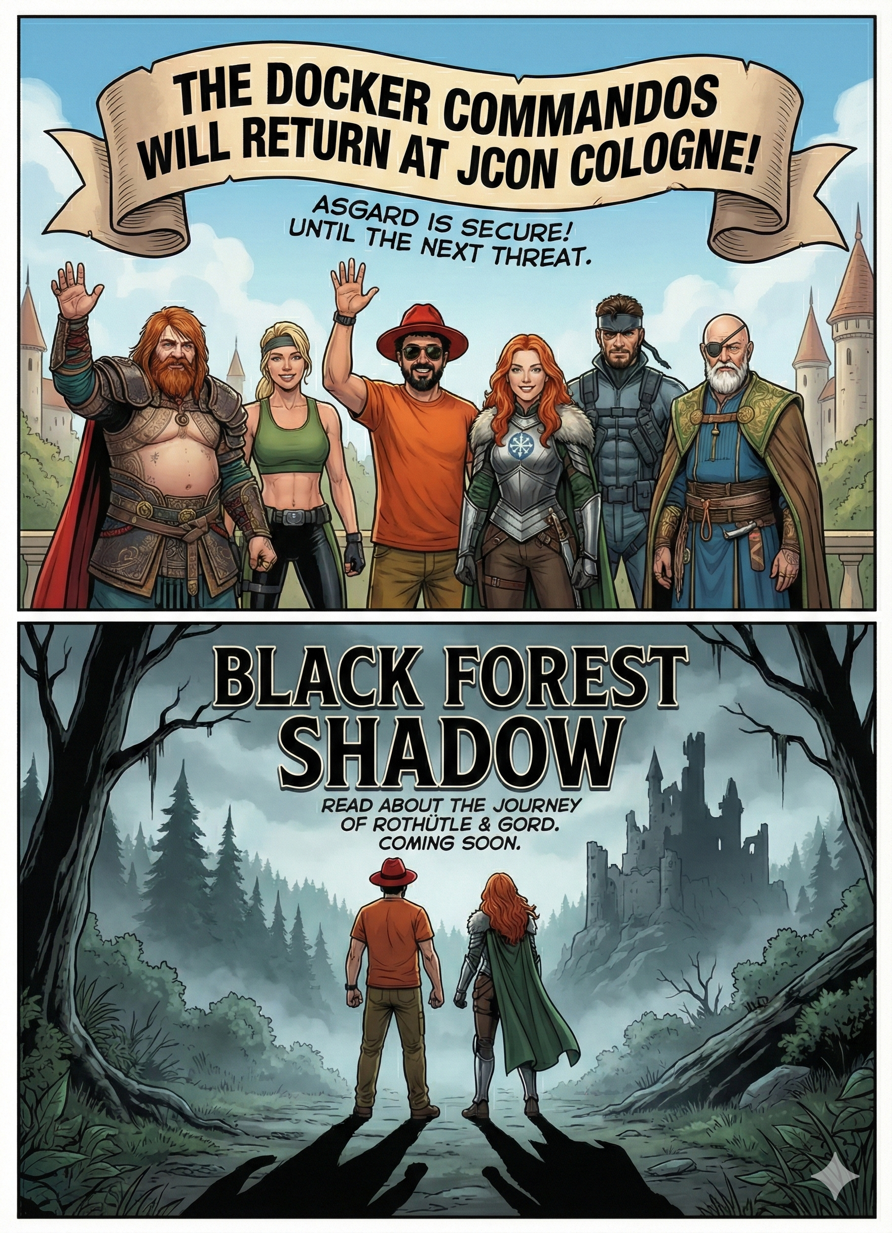 Black Forest Shadows became the narrative backbone of the Docker Commandos universe. On the turn of the year, as I was preparing for 3 confirmed talks in the first half of 2026, I recreated the Teams background with more recognizable characters: