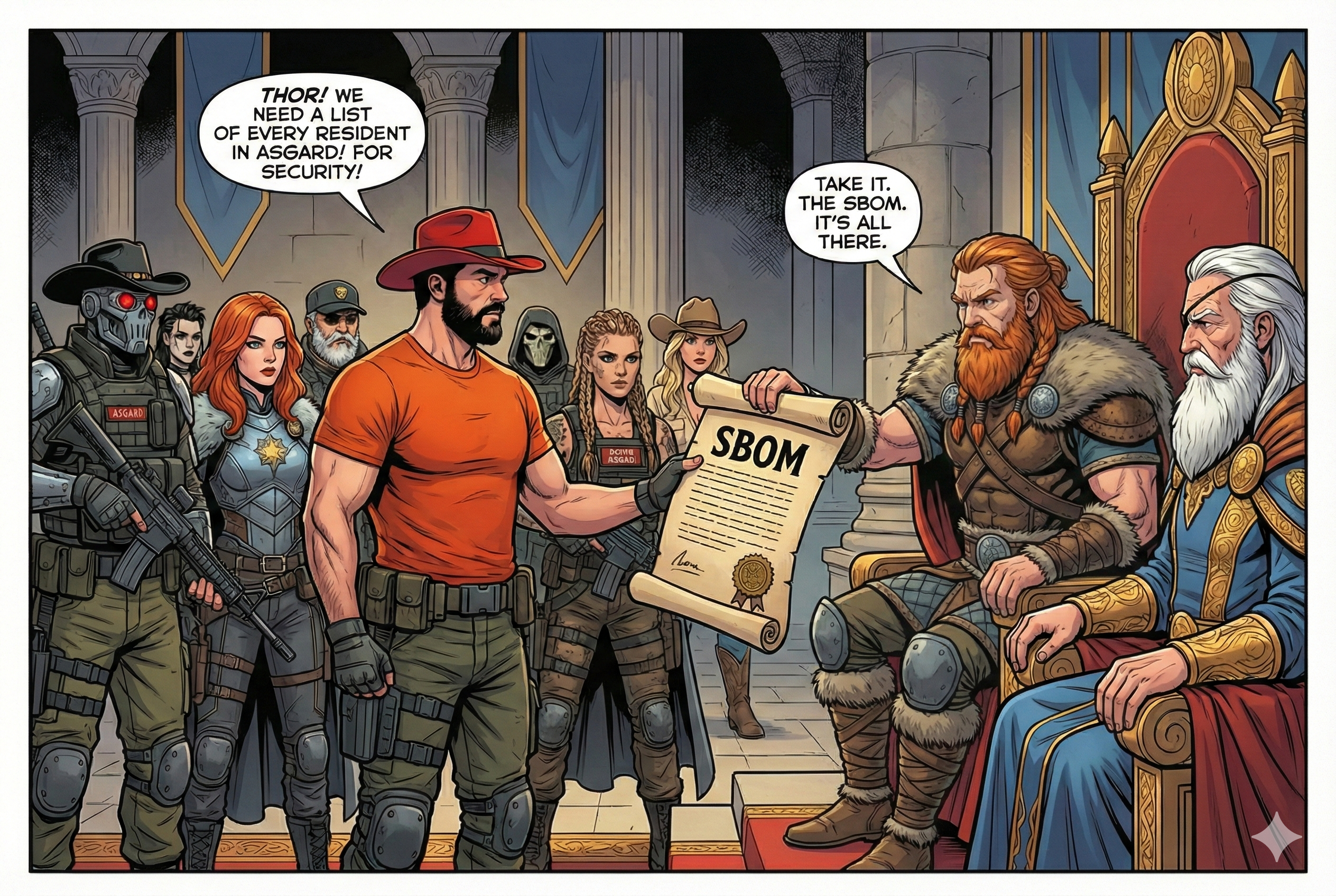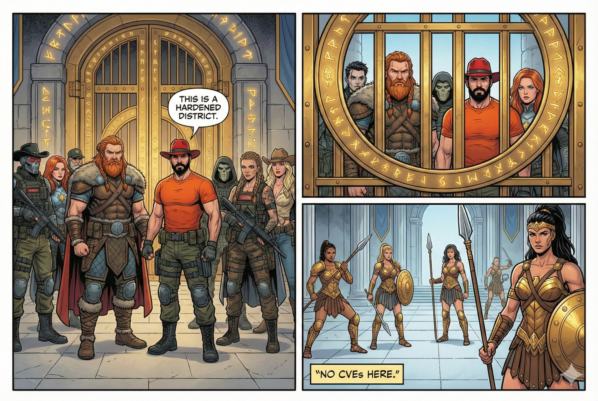 Thor enters Odin's chamber hastily, "Father, Asgard is under attack! Shadow monsters called CVEs are in Asgard and my hammer Mjolnir can't destroy them!" Odin looks at him calmly, "Summon the Docker Commandos!"